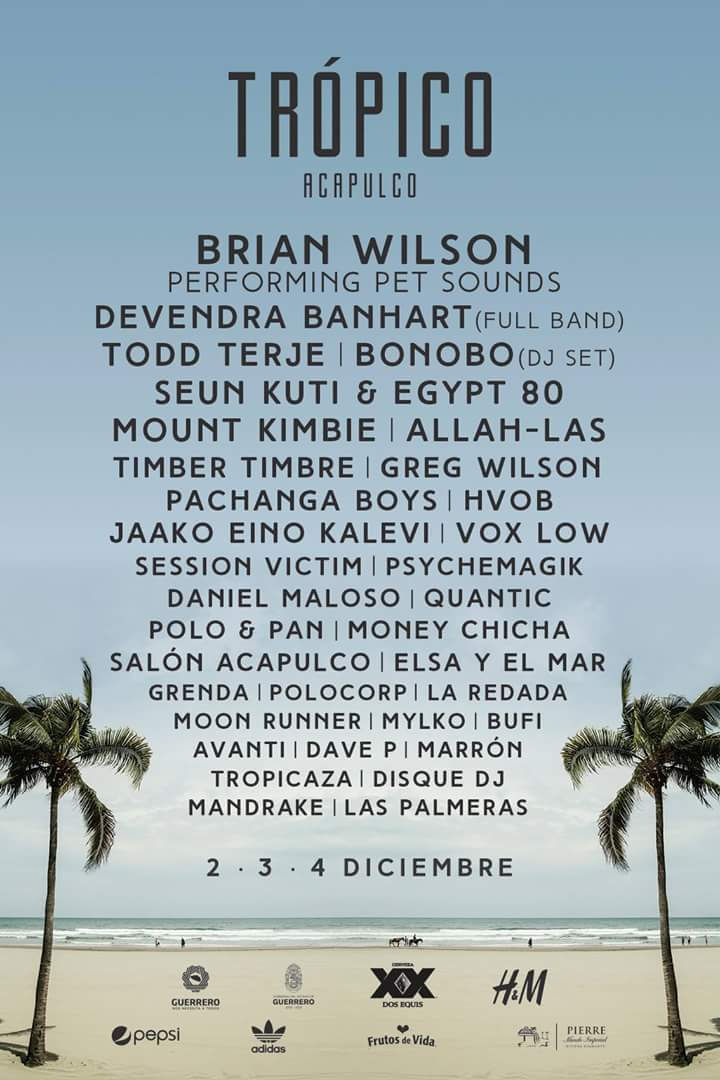El legendario Brian Wilson retomando su álbum Pet Sounds, Devendra Banhart y su agrupación completa, el duo británico de música electrónica Mount Kimbie, el regreso del Pachanga Boys, el regiomontano productor y Dj Daniel Maloso, los beats de Bufi entre otros, son los actos escogidos para poner el ambiente tropical en esta nueva edición del festival.